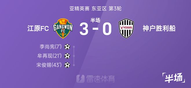 镭速体育10月22日-25日 25/26 亚洲精英赛东亚区第三轮25/26江原FC对阵神户胜利船。中场休息后,凭借李尚贤、武在仁、宋俊时的进球,江原FC 3-0 神户胜利船。第7分钟,李相贤禁区后大力抽射破门,江原队电击破门,1-0。科比第10分钟,李相勋横扫门前,将球打入空门。裁判查看VAR后判定判罚无效。第21分钟,莫头球再次破门,主裁判查看VAR后判定判罚有效。第43分钟,江原道2-0,孙俊锡禁区外远射破门,荏原3-0领先科比。常规赛第18分钟,穆禁区前大力抽射,但皮球险些偏出。第28分钟,金健熙突入禁区。d 进行了一次齐射,但险些击中。 40分钟 黄牌 - 徐珉宇(江原FC) 技术犯规统计 球员名单 江原FC首发队员:21-朴忠孝、23-图奇、34-宋俊锡、99-姜俊赫、47-申敏河、97-李宥贤、42-武在、4-徐珉宇、 7-金大元、22-李尚勋、 9-金健熙姜 原替补FC成员:1-李光元、33-洪哲、24-朴浩英、13-李智伊、18-金江九、70-具凤哲、8-姜勇、14-金大宇、73-仁日禄、26-金珉俊、 27-Jin Do-seon 神户胜利船 初始成员:7 1-贡田修一、31-岩波拓也、15-本田佑希、23-广濑陆人、41-长门克也、30-山内翔、77-克里斯曼、35-富永征七、14-小泷泰也、26-帕特里克、29-小松连神户胜利船替补:60-卡达 大河、32-乌本、16-卡埃塔诺、54-原宗太、13-佐佐木大树、2-饭野七贤、25-书仙游也、52-滨崎贤人、56-里美大福、9-宫城将军、53-渡边隼人、55-宫原雄太
